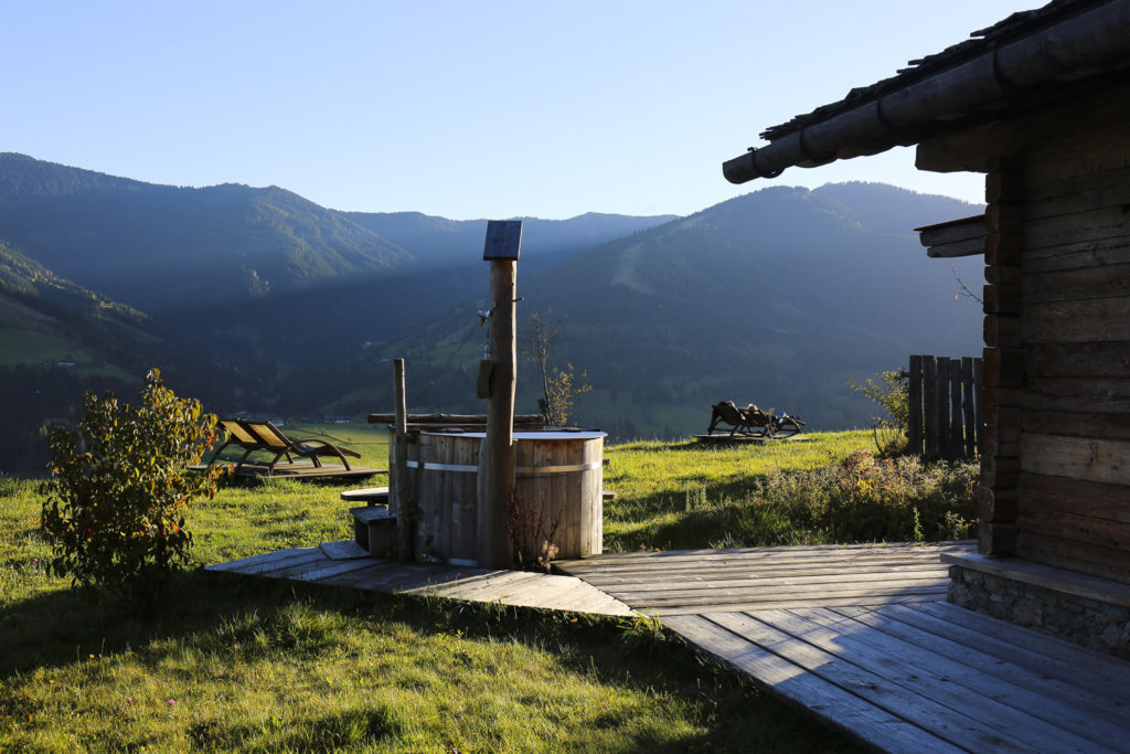 Renate und Huwi, die Besitzer der Priestegg, sind ein Power Couple, die mit Persönlichkeit und Leidenschaft hier etwas Einzigartiges geschaffen haben. Die Priesteregg ist eine kleine Bergwelt in sich. Auf einem Hochplateau unterhalb der Leoganger Steinberge wurden 15 neu erbauten Chalets zu einem einzigartigen Bergdorf zusammengeschlossen. In diesen Chalets haben sie alle Träume von romantischen Hütten bis ins kleinste Detail verwirklicht – ohne auf den Segen der Moderne zu verzichten. Hier dominiert die traditionelle Holzhütten Konstruktion wie man es sich wünscht, richtig gemütlich, aber mit dem passendem Twist einer hochmoderne Ausstattung mit Sauna, Hotpot und Fußbodenheizung, die aber nicht wirklich sichtbar ist. Die offene Badewanne im zentralen Wohnzimmer verrät viel über die Philosophie, die Renate und Huwi teilen: Für ein paar Tage in eine ganz andere Welt eintauchen und sich ganz zu entspannen und aussteigen. Auf dem „Dorfplatz“ findet einmal pro Woche ein gemeinsames Brot oder Kaiserschmarren-Backen statt – sonst bekommt man von den „Nachbarn“ nicht viel mit. Alle wollen sich zurückgezogen mit ihren Liebsten in dieser schöner Natur mit einem phänomenalen Blick auf das Tal einfach nur entspannen. Unterhalb des Dorfes befindet sich noch ein sehr schönes urgemütliches Restaurant mit einer traditionellen Küche, aus Lokalem mit dem Gewissen etwas.