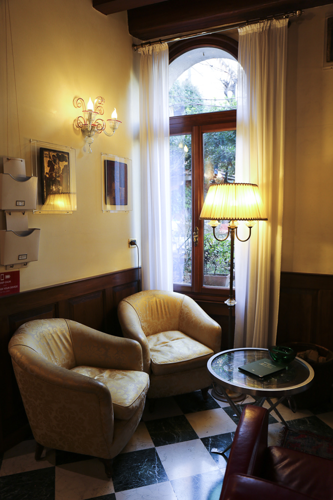 Die Pensione Accademia ist eine wahre Oase – und die kann man in Venedig gebrauchen! Der Garten nach vorn und nach hinten hinaus läd zum Sitzen und Essen. Der Frühstücksraum ist groß und hell und strahlt Grandezza aus, was auch wiederum sonst nur in Grand Hotels üblich ist. Die Zimmer haben Holzboden und sind mit den typischen venezianischen Möbeln ausgestattet. Die Badezimmer sind etwas altmodisch, aber noch okay, doch die vielen Nutzungsmöglichkeiten der Lobby und des Gartens sind den Preis allemal wert.