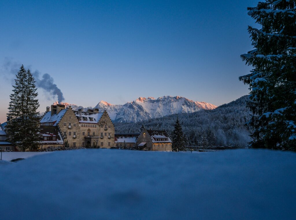 Die britische Adelige Mary Isabel Portman hat 1913 mit einem einzigen Blick beschlossen, dass sie genau hier ihr Schloss bauen will. Der britische Geist hält sich bis heute, weil die Londoner Designerin Ilse Crawford das Wellnesshotel eingerichtet hat. Dabei erinnert das ganze mit seinem Humor und Schick an die „Soho-Houses“ mit den überdimensionalen Stehlampen, Arne Jacobsens Schwan-Sesseln, den Tischen von Eero Saarinen und Bubble Lamps von George Nelson eingerahmt von Wänden mit satten Farben. Nach einem Tag im Wellness Bereich bieten sich einem viele Möglichkeiten zu entspannen: Im Spielezimmer, in den Kaminzimmern oder an der Bar. Überall dort kann man wunderschöne Ausblicke auf die Gebirgsmassive Wetterstein, Karwendel und die Zugspitze, auf Wälder und Blumenwiesen genießen. Das Kranzbach ist eine ganz eigene Welt mitten im Naturschutzgebiet. Die geschmackssicheren neuen, modernen und lichtdurchfluteten Anbauten fügen sich perfekt in die Landschaft ein. Wer es aber eigenwilliger haben will, wählt ein Zimmer im „Mary Portman House“ mit hohen Decken, verspielten Tapeten und Wolkenbetten.